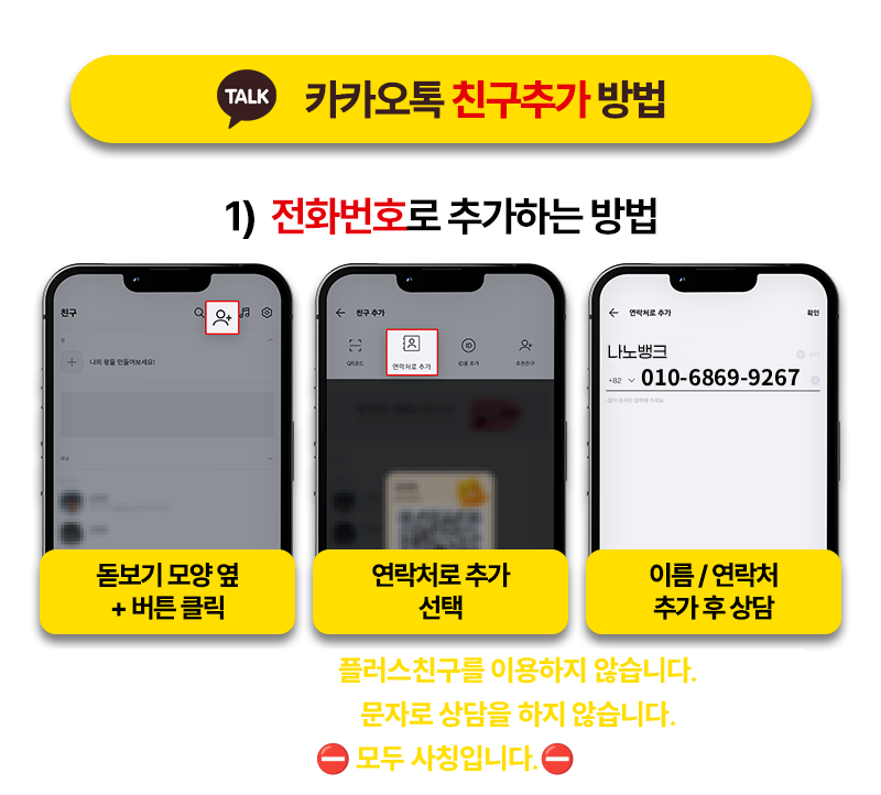 나노뱅크는 플러스친구와 문자 상담으로 운영을 하지 않습니다. 이용에 각별히 주의 부탁드립니다.