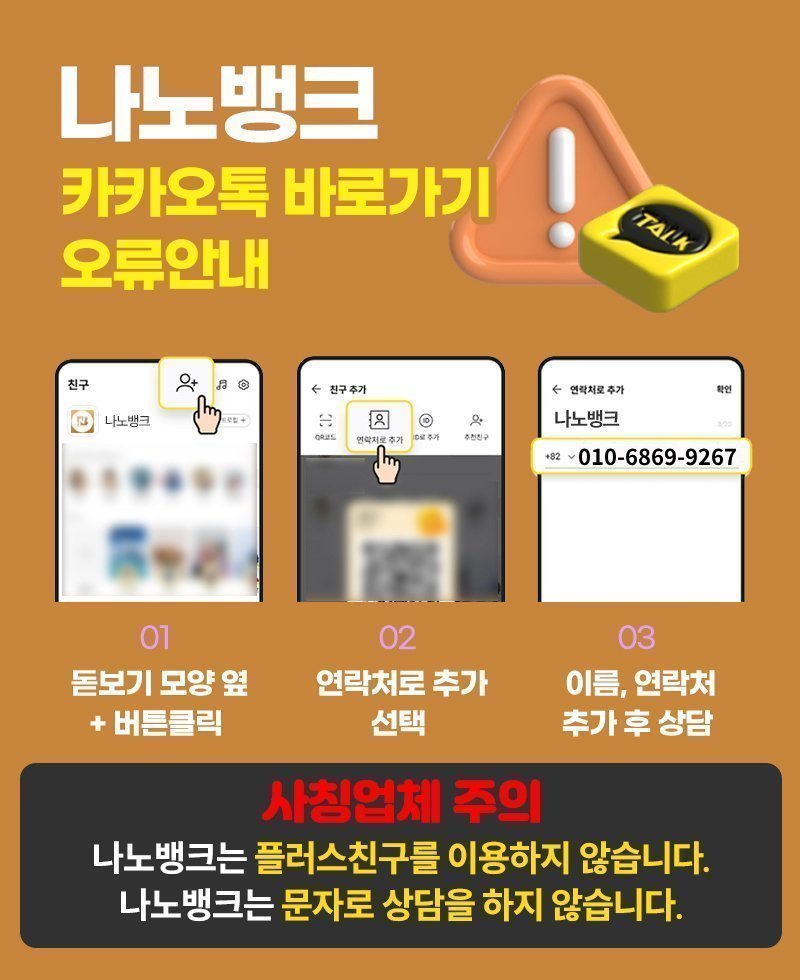 나노뱅크는 플러스친구와 문자 상담으로 운영을 하지 않습니다. 이용에 각별히 주의 부탁드립니다.